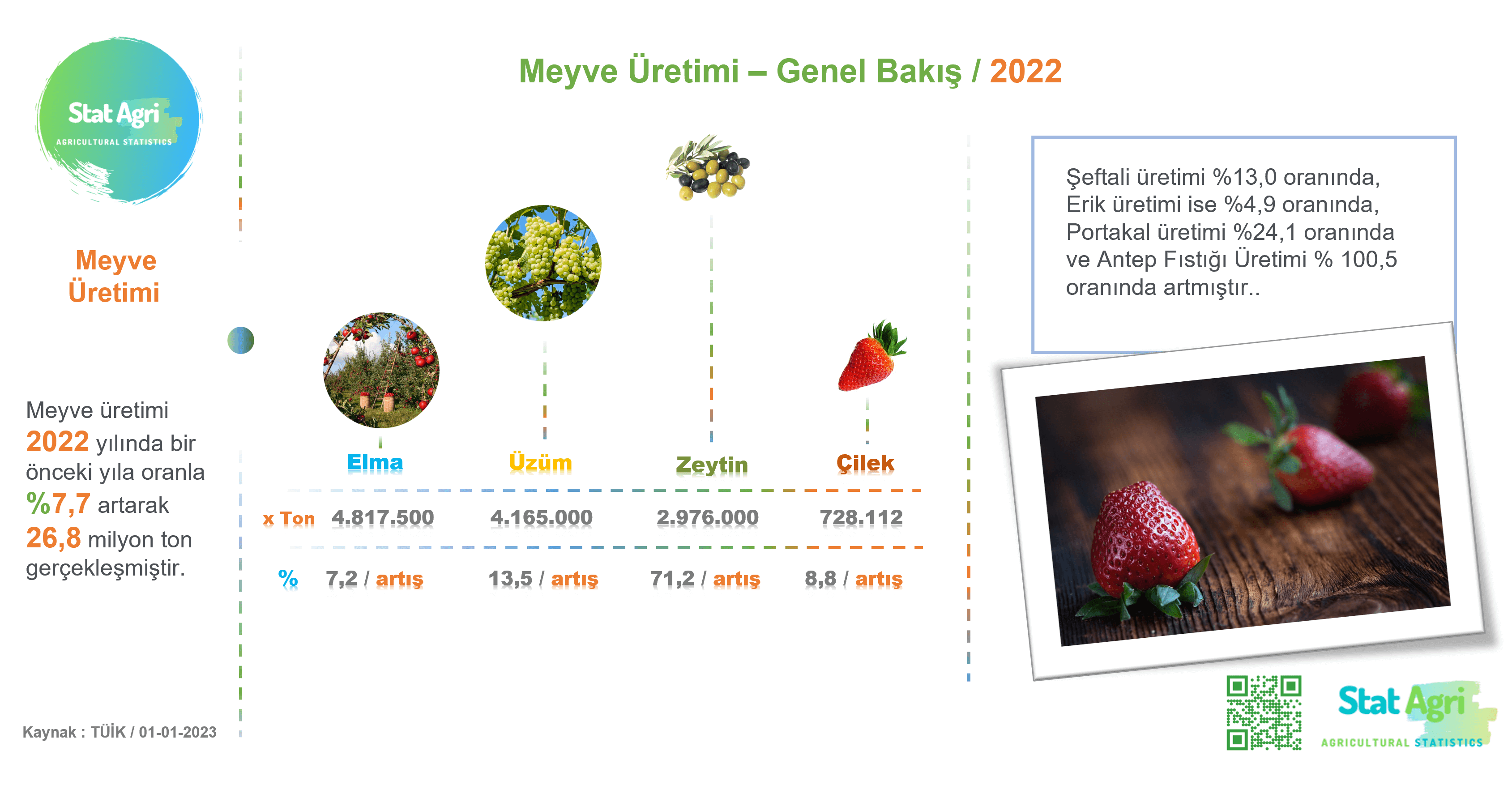 Meyveler grubunda üretim miktarlarına bakıldığında, bir önceki yıla göre elmada %7,2, üzümde %13,5, şeftali ve nektarin toplamında %13, erikte %4,9, çilekte %8,8 ve zeytinde %71,2 oranında artış olduğu görüldü. Ayrıca incir üretimi %9,4, muz üretimi %12,9 oranında arttı.