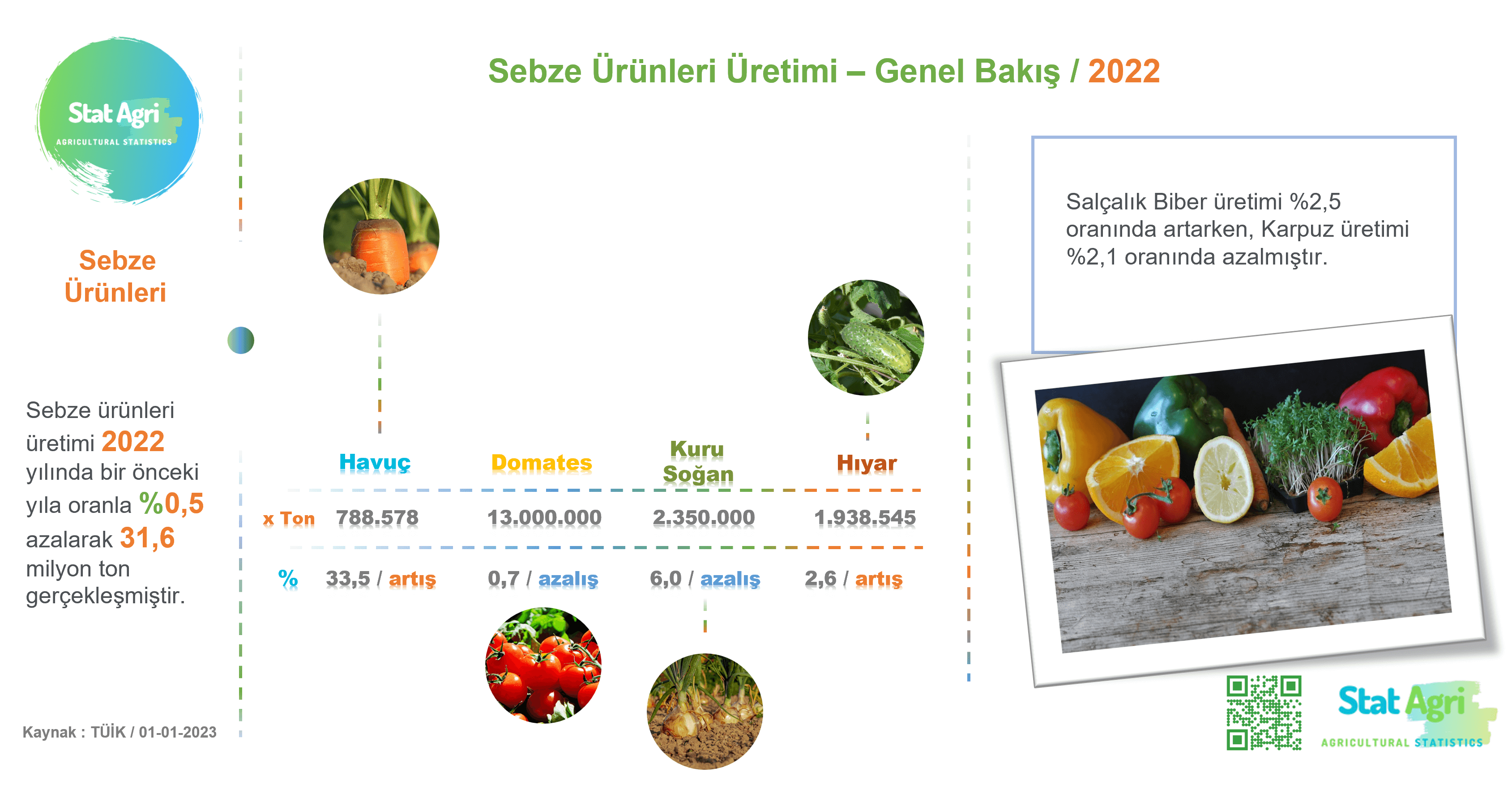 Sebze ürünleri üretim miktarı 2022 yılında bir önceki yıla göre %0,5 oranında azalarak yaklaşık 31,6 milyon ton olarak gerçekleşti.